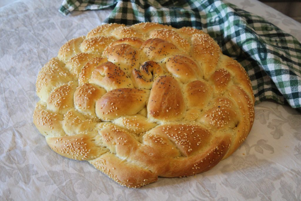 • Unos círculos para formar trenzas, que envolver para crear una espiral; pincelar con el huevo ligeramente batido y espolvorear con semillas. Dejar fermentar hasta duplicar su tamaño. Recomiendo un cazo de agua hirviendo dentro del horno, distribuye calor y humedad.