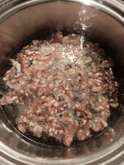 Poner el pan a remojar en la leche, mientras tanto sumergir las nueces en agua hirviendo durante cinco minutos para eliminar la piel
