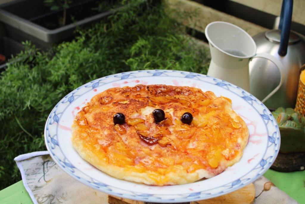 Pastel de melocotones en sartén. Fácil, bueno, rápido.