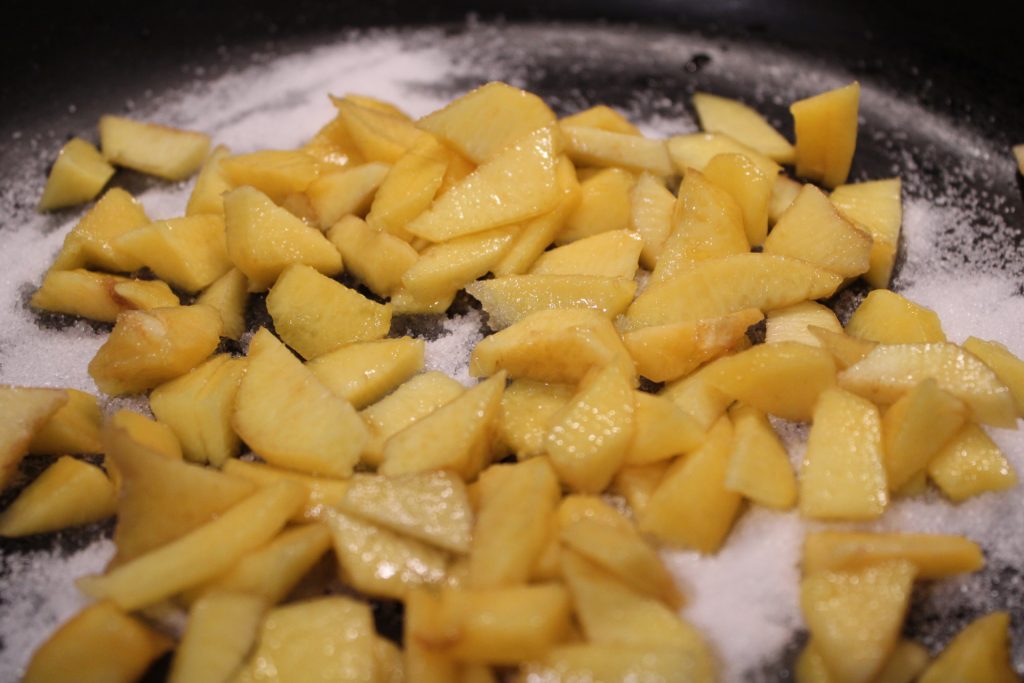 • Primero, pelad los melocotones, esta operación no es necesaria si utilizáis nectarinas. Unidlos a 100 g de azúcar y hacedlos caramelizar en sartén. Finalmente, añadid la nuez de mantequilla. Mantened la hornilla a fuego bajo.