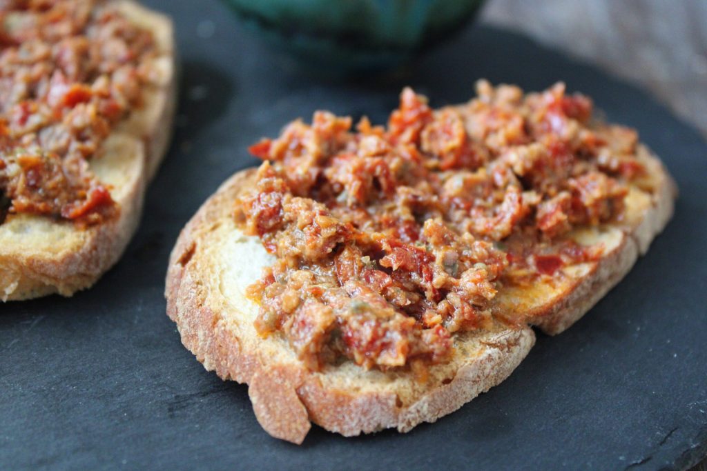 Pesto de tomates secos con anchoas y aceitunas. Como suele suceder, algunas recetas cada año son indispensables en las reservas familiares; en realidad no me gusta mucho hacer conservas en aceite, por lo que preparo un tarro y lo consumo de inmediato. Mi miedo al botulismo, ayudado por la disponibilidad de estos simples ingredientes que ahora se pueden encontrar en cualquier época del año. Así que este pesto puedo comerlo o regalarlo cuando quiera. Tiene una simplicidad y rapidez típica de este tipo de preparación, no uso el robot de cocina, mis tomates secos aceitunas, alcaparras y anchoas, que compro directamente del vendedor de anchoas. Así puedo contar con productos de primera calidad. Prefiero comer menos, pero bien. Sigo las estaciones y recojo frutas y hierbas comestibles en los campos baldíos. Hago trueque con los productos que tengo de más, a cambio de otras provisiones. Esto me permite tener siempre alimentos km 0 de excelente calidad.