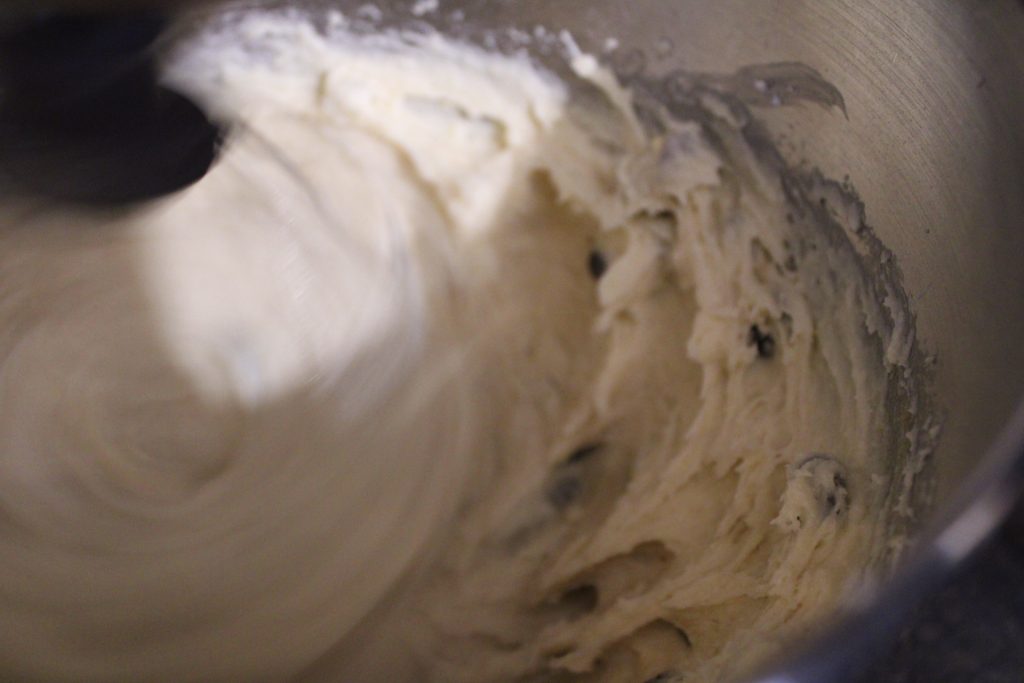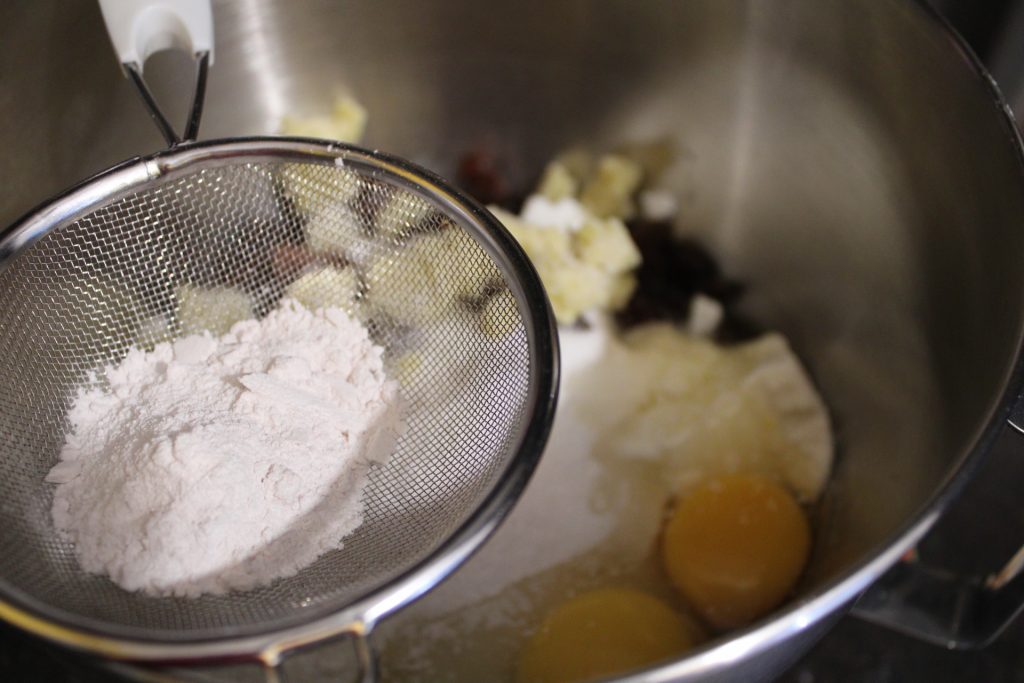 • Colar la ricotta y mezclar con la harina tamizada junto con la levadura. Añadir luego todos los ingredientes; si prefieres, remoja las pasas en licor Strega, (yo no lo hago porque no me gusta sentir las pasas mojadas).