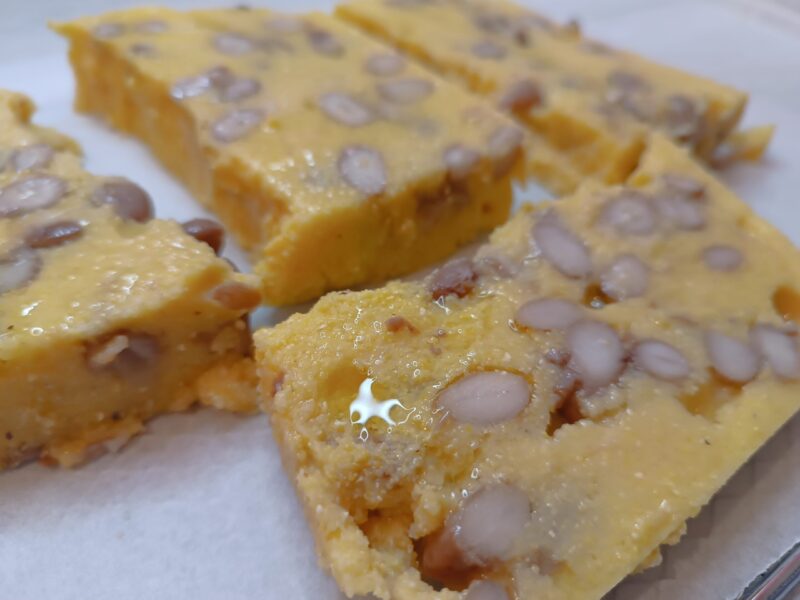 Cuando los frijoles estén cocidos, escurridlos, si os gusta no botéis el caldo de cocción, podéis usarlo para una sopa, desmenuzad el cotechino después de haberlo privado de la piel o cortad la corteza en trocitos… Verted todo en la polenta, dejad que tome sabor unos diez minutos y dejad enfriar bien… Calculad comerla en la noche!