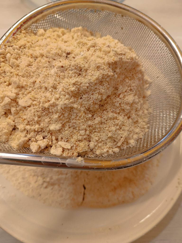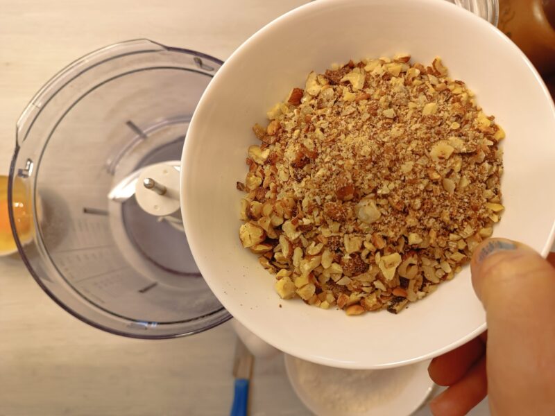 • Mientras tanto, extrae la harina de las avellanas, yo prefiero añadir también un poco de harina blanca quitada del peso que sirve para mantener las avellanas secas y polvorientas.