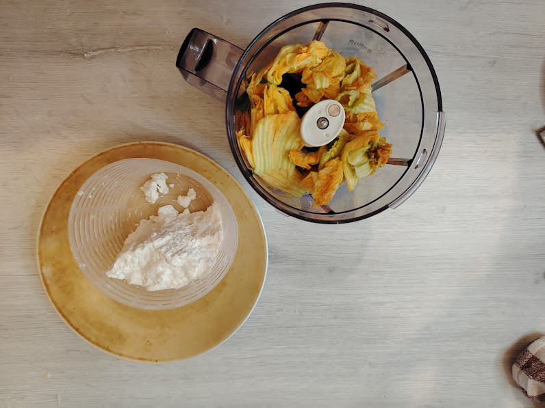 En la licuadora, coloca la mitad de la ricotta, las flores, la albahaca y la cáscara de limón. Redúcelo a pasta y añade el resto de la ricotta. Agrega sal y queso. Mezcla bien y cubre hasta su uso