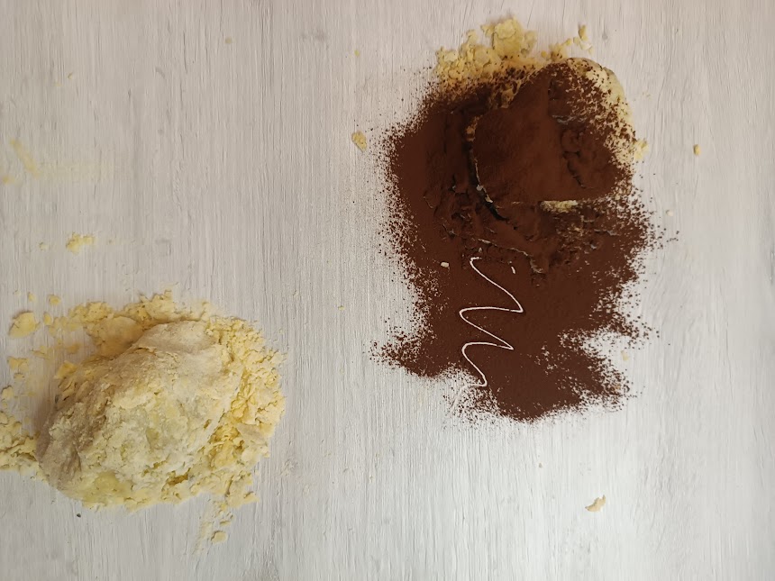 Amase la sémola con los huevos en dos tazones diferentes, uno con el cacao; cierre con film hasta su uso.