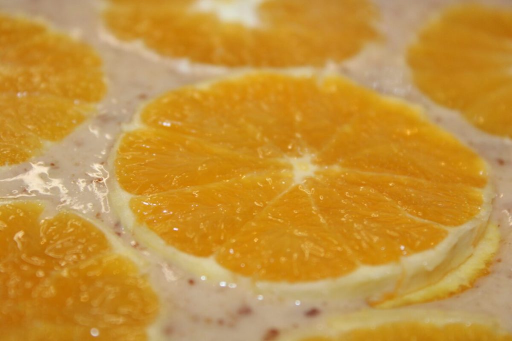 • En un molde, el que veis en la foto tiene un diámetro de unos 20 cm, el resto hice porciones individuales; pelad las naranjas y colocadlas en la superficie. Hornead a 180 grados durante unos 20/25 minutos, en horno precalentado.