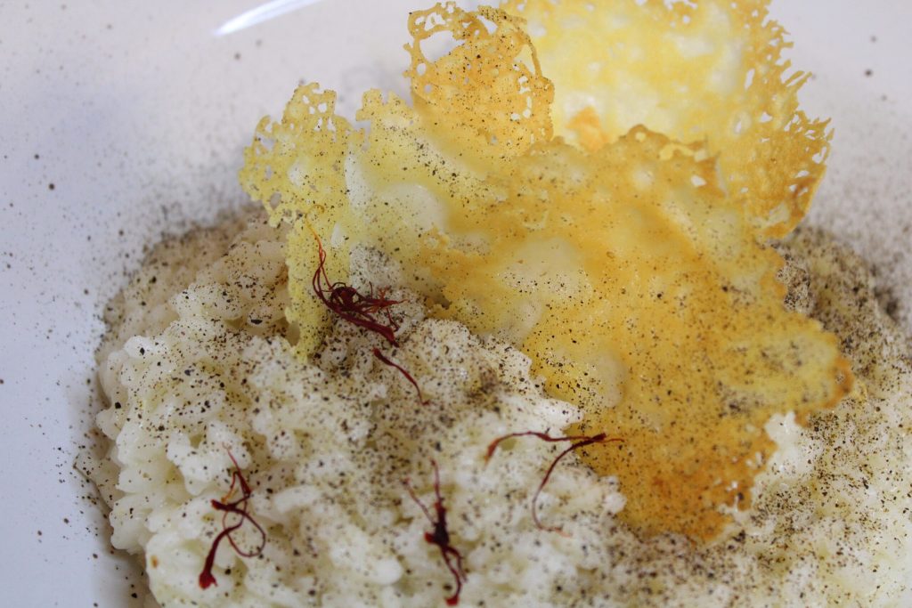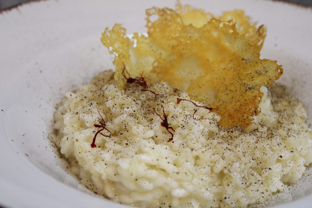 Un primer plato simple que deja una excelente impresión. Las tostadas crujientes y saladas darán un toque extra al plato creando un agradable contraste de sabores. El pecorino dorado tendrá un sabor fuerte y también amargo que se presta bien a combinarse con la cremosidad y dulzura del risotto. La pimienta, además de proporcionar aroma, dará una nota picante al plato.