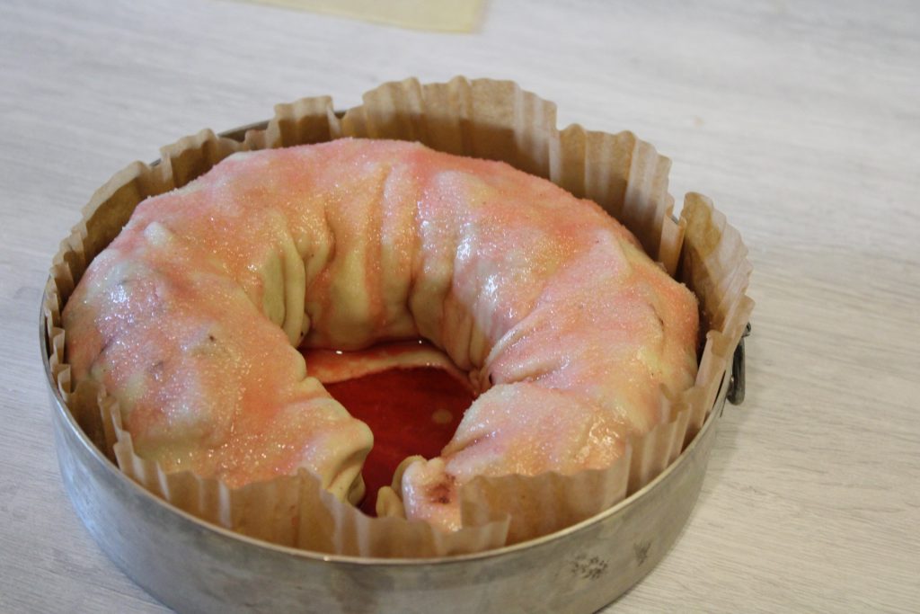• Y acomoden en el molde, mojen la superficie con alkermes y horneen en horno precalentado a 180 grados durante unos 40 minutos