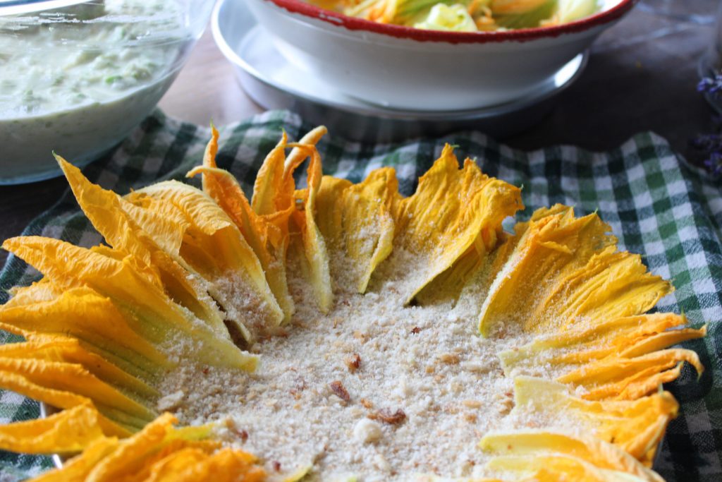 Forrar los bordes de la fuente con las flores y un poco de pan rallado en el fondo y verter la mezcla de calabacín.