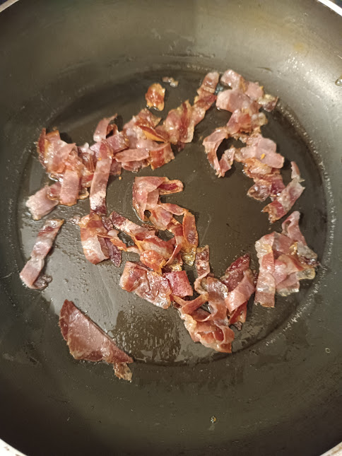 • Mientras tanto, después de haber puesto la cacerola con el agua y la sal en el fogón cortad en tiras la coppa y tostádla en una sartén antiadherente, la grasa se derretirá y dará aroma a la pasta