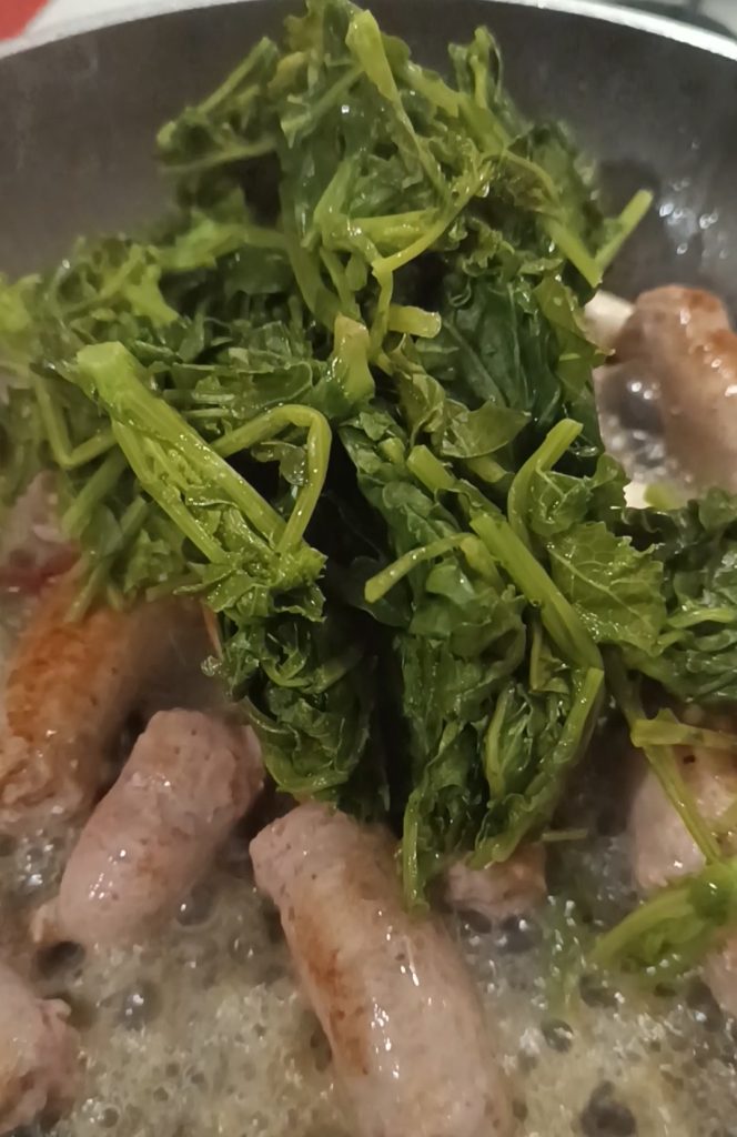 • Escurrid los grelos y vertedlos en la salchicha, ajustad de sal y dejad secar el exceso de agua de cocción