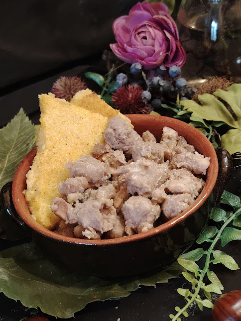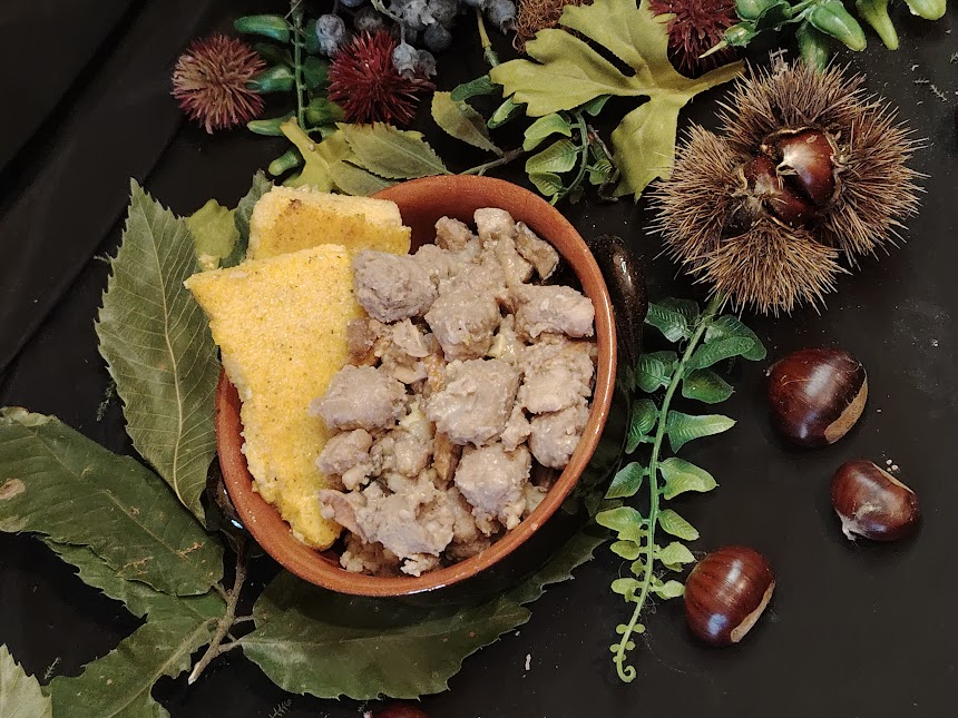 Pero volvamos a nuestra receta, polenta, setas, castañas y salchicha… Ingredientes de cultura rural, de cocina rústica invernal y sabrosa, rica en aromas y calor.