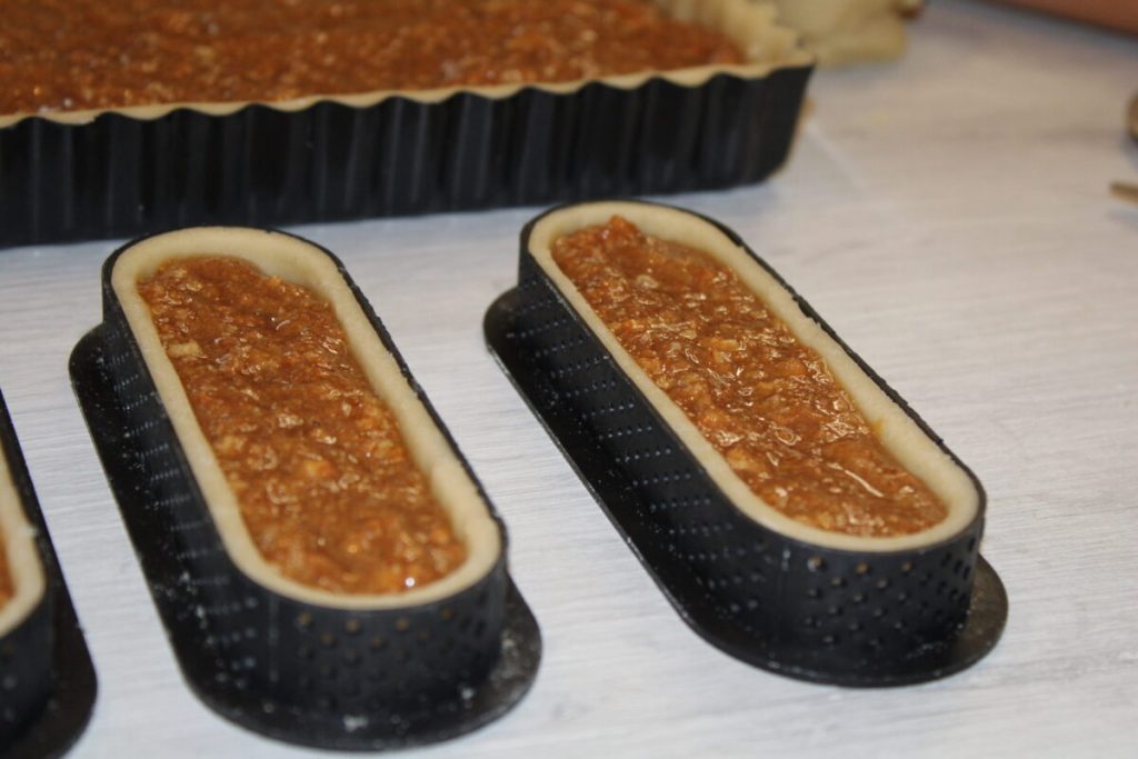 Masa quebrada, peras, amaretti y caramelo