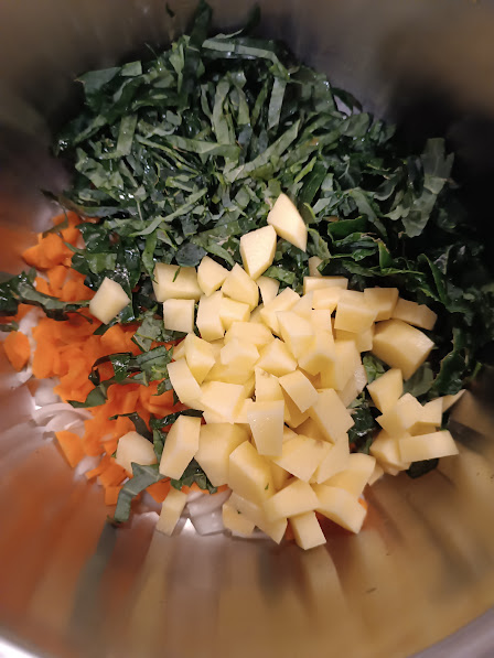 Antes de comenzar, corte todas las verduras en trozos o tiras en caso de las coles. Haga un sofrito con las cebollas, apio y zanahorias, luego añada las coles…
