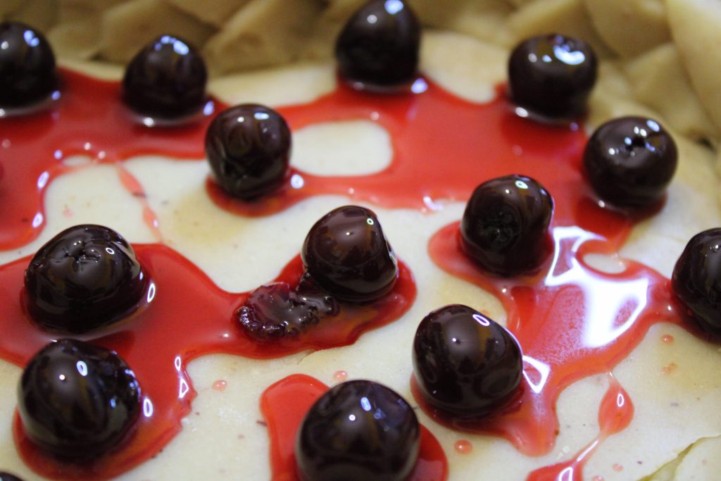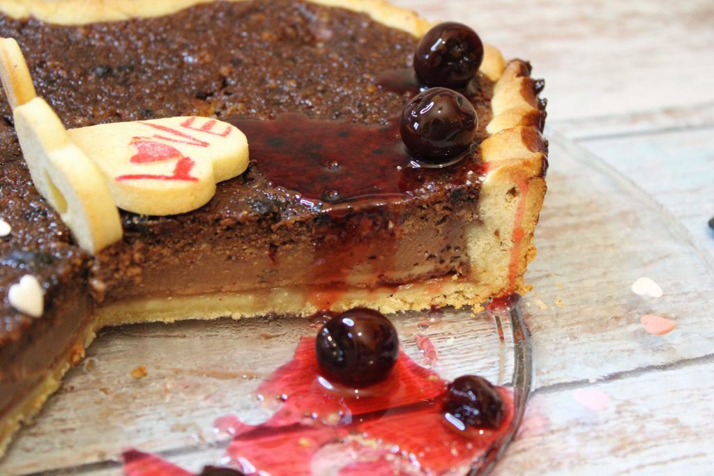 Pero vuelvo a la tarta: una tarta con un relleno cremoso de amaretti y guindas confitadas. Un sabor particular, contrastado por la presencia del chocolate amargo.