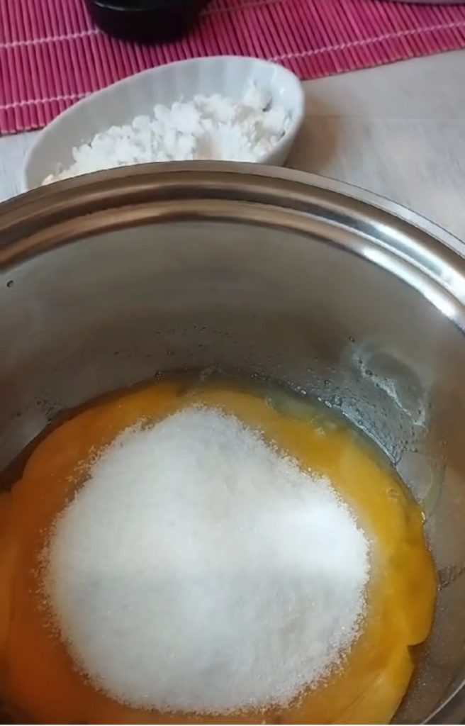 En el cazo, mezclen las yemas de huevo con 100 gramos de azúcar, batan ligeramente y añadan la maicena