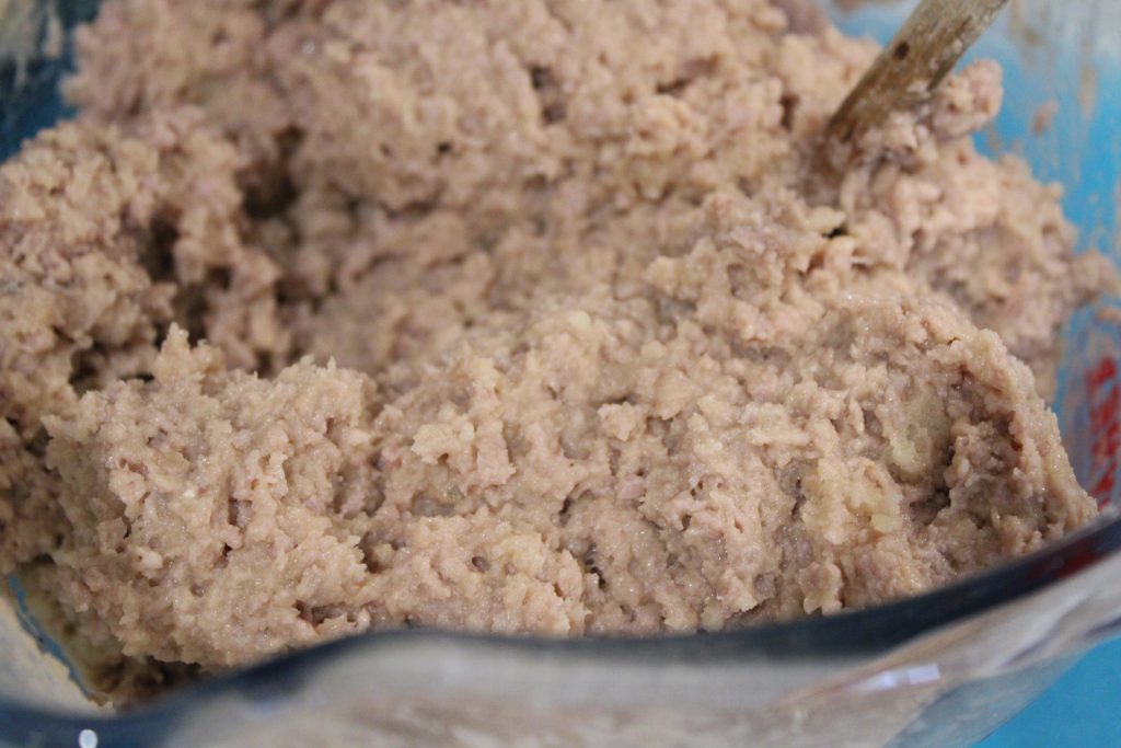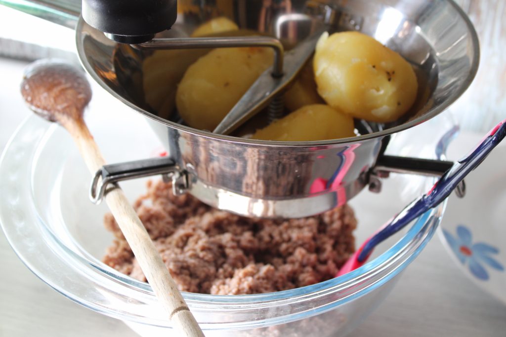 Dorar la salchicha sin piel en poco aceite. Desmenuzar bien o pasar por el mixer. Unir en un bol las patatas aún calientes, pasadas por el pasa puré, el puré de castañas y ajustar de sal.