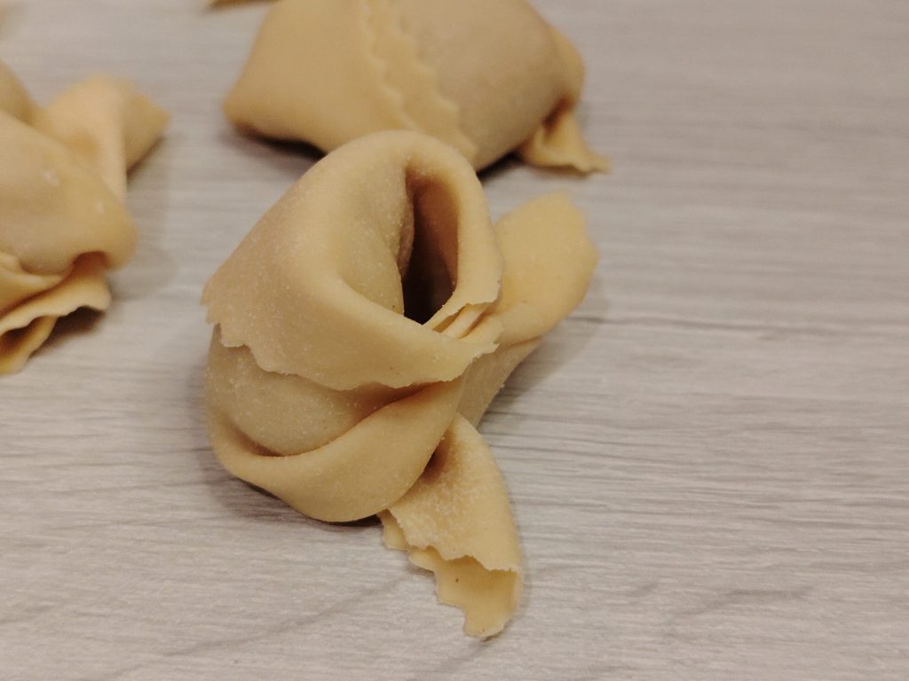 Tortelli con el lazo. Castañas y salchicha. Es difícil conocer cuántas formas y rellenos tienen los tortelli; Italia, un país con mil recursos. Me vienen a la mente los tortelli con la calabaza, Mantova y Cremona con la mostarda, hierbas y espinacas en Emilia y en Toscana… En fin, hay para todos los gustos. Los tortelli con la cola, o ricos en sapa. Esta vez los hice con castañas y salchicha. En verdad, un plato humilde, de cuando se podía tener el cerdo, en mi territorio debido a la peste porcina, se tuvo que renunciar a esta tradición. Quién sabe cuándo se podrá nuevamente criar este importante animal para el consumo familiar. Los tortelli con el lazo, un plato simple pero rico. De aroma y suavidad. Un cremoso relleno encerrado en una pasta al huevo rústica. He unido diversas tradiciones, quizás porque esta combinación me hace recordar cuando en mi casa se preparaba la salchicha y se cocían las últimas castañas secas. Los junté y nacieron ellos: Tortelli con el lazo, castañas y salchicha.