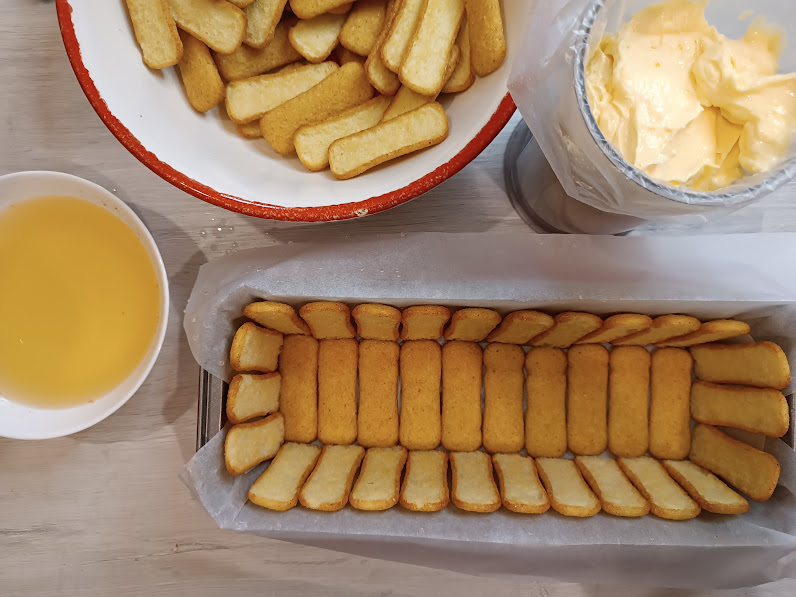 Forrar el molde con papel de horno y colocar los pavesini como en la foto, después de haberlos mojado en el moscato