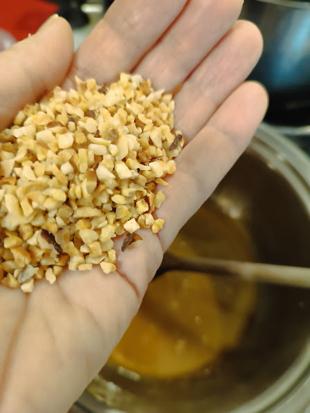 Sobre papel de horno, cubrir con otra hoja y aplanar con la ayuda del rodillo; apenas frío reducirlo a granillo con la ayuda del molinillo de café o robot de cocina, o mazo de madera para carne