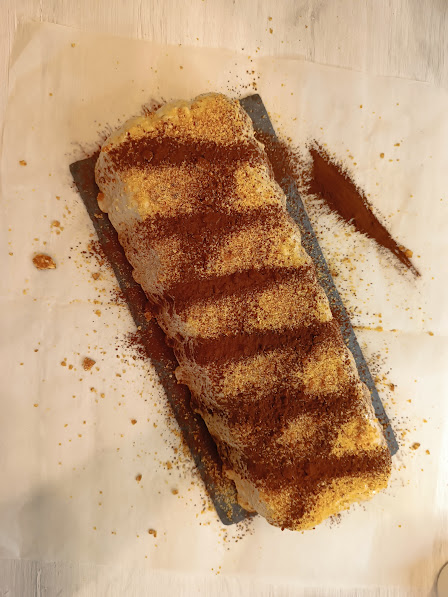 Última capa, pavesini. Cubrir con film y meter en la nevera hasta el siguiente paso.
