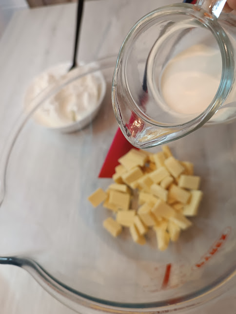 • Mientras tanto, rompan el chocolate blanco y añadan un poco de nata caliente para que se derrita.