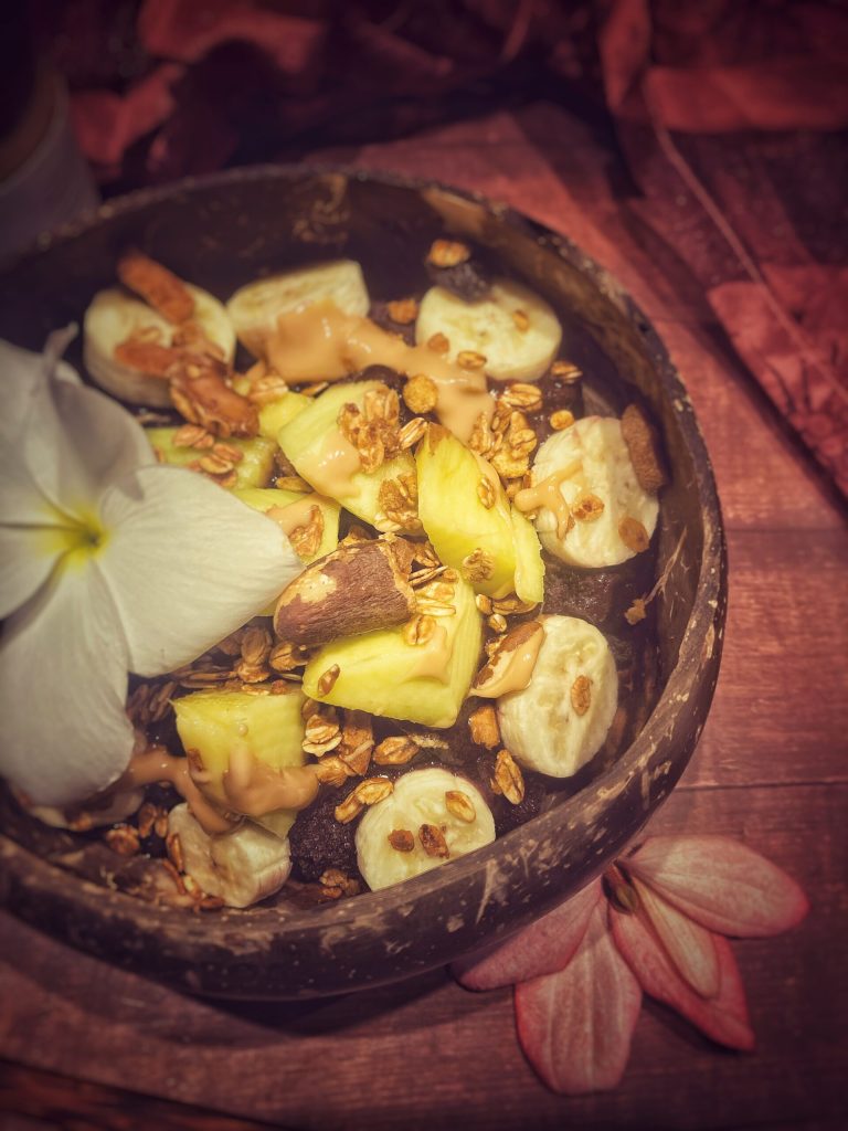 Pero empecemos por el principio… ¿Qué es el açai? Es una planta de la familia de las palmeras que solo crece en la Amazonía, su fruto es una baya de color violáceo. Se considera un ‘superalimento’ por sus capacidades nutritivas y gracias a la alta presencia de flavonoides es la fruta con la más alta concentración de antioxidantes del mundo, aproximadamente 15 veces mayor que la uva negra. En Brasil el açai na tigela es un sustituto de una comida o bien un desayuno o merienda sustanciosa y energética. La baya de açai, debido a su delicadeza, no se encuentra fresca, sino solo en forma de pulpa congelada. La diferencia con el açai bowl, es decir, su versión americana donde realmente triunfa especialmente en California, es que esta mezcla la pulpa de açai con plátano y leche, mejor si es vegetal, mientras que en Brasil el plátano y la leche no son obligatorios. Hay infinitas versiones todas con fruta fresca y granola.