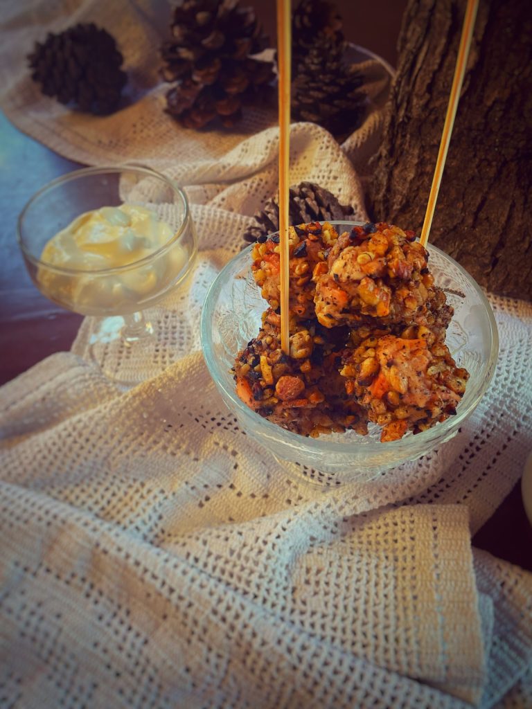 Salmón salvaje de Alaska cocido en oleococción y posteriormente envuelto en un crumble de nueces pecanas para formar unas pequeñas albóndigas estilo «finger food» cocidas en freidora de aire y acompañadas de crema agria.