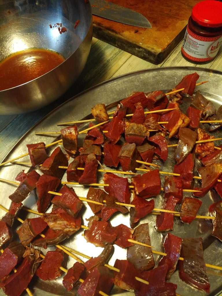 Pero después de probar el espetinho de coração de frango en Brasil no podía sino elegir un homólogo peruano: Anticuchos, brochetas hechas con corazones de vaca, ensartados en pinchos preferiblemente de bambú, marinados “a la peruana” en una salsa de cebolla, ajo, orégano, pimienta, comino, ají Panca (crema de ají peruano) y vinagre de vino, brochetas que luego se cocinan a la parrilla o en una sartén.