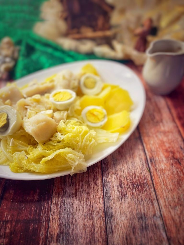 ▶De aquí el Bacalao de la consoada cocido con col y servido con patatas hervidas y huevos duros, sazonado con aceite aromatizado al ajo.
