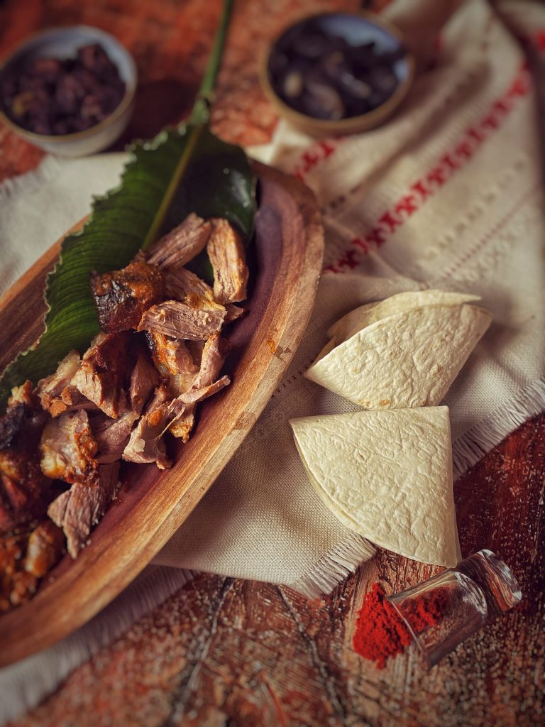 Suele consumirse con acompañamientos como tortillas de maíz, cebollas rojas en escabeche, frijoles negros fritos y chiles habanero.