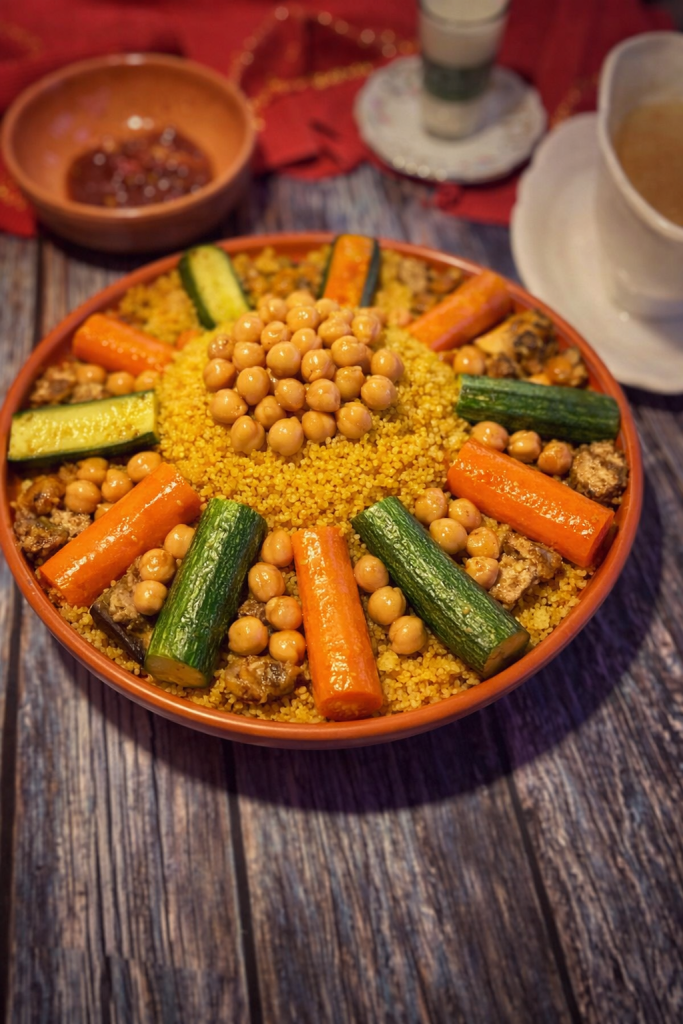 Usa el caldo del estofado: En lugar de agua simple, utiliza el caldo filtrado que has preparado con la carne y las 7 verduras. Viértelo hirviendo sobre la sémola (misma proporción: 1 taza de cuscús = 1 taza de caldo).