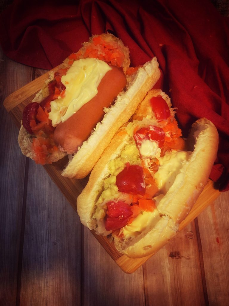 Brasileño: salchicha, queso fundido y aguacate. Toma el nombre de los colores de la bandera brasileña.