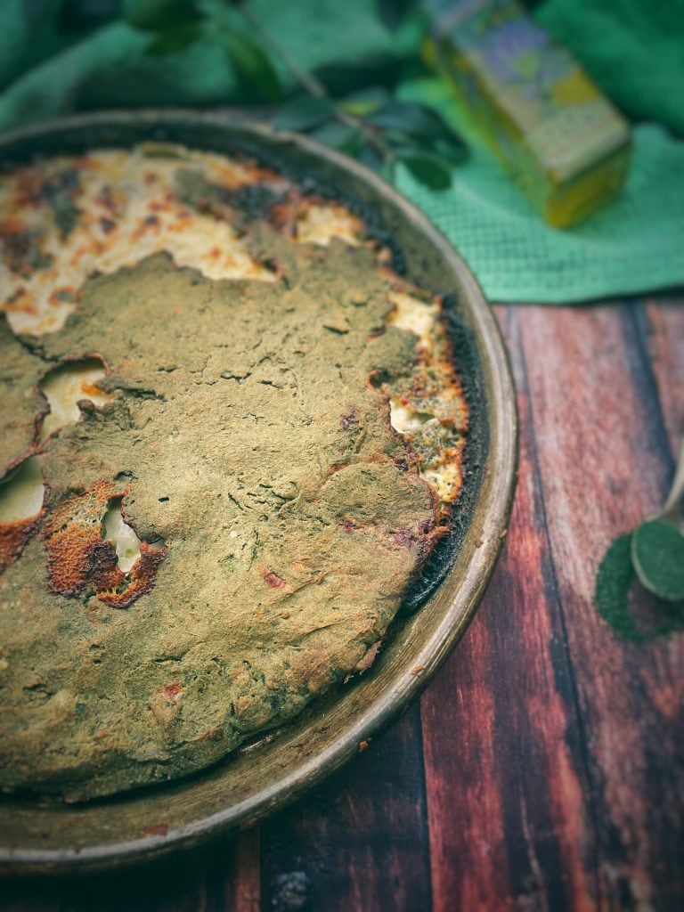 Mi versión prevé una mezcla de harina de trigo sarraceno, fécula y almidón, junto con espirulina, y rellenada con stracchino.