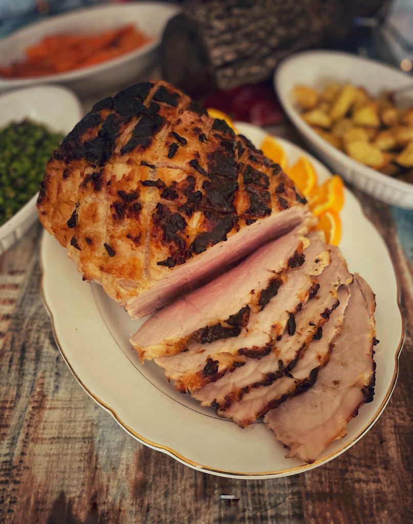 En la tradición del Sunday Roast inglés, el gammon se sirve con guarniciones como patatas asadas, guisantes, col, zanahorias y chirivías, gravy o salsa de mostaza. Yo he optado por naranjas, patatas asadas, guisantes y zanahorias glaseadas.