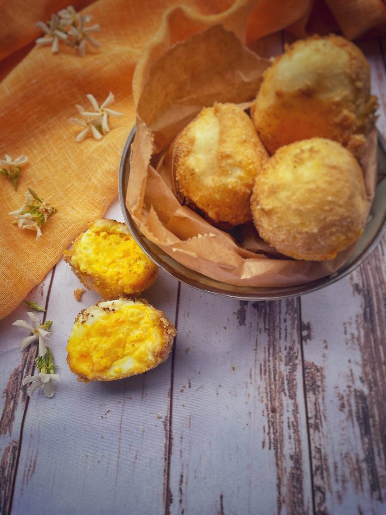 Los Huevos a la monja son una receta napolitana que se sirve sobre todo en primavera, durante las fiestas de Pascua: huevos rellenos de bechamel mezclada con yema cocida, empanados y fritos.