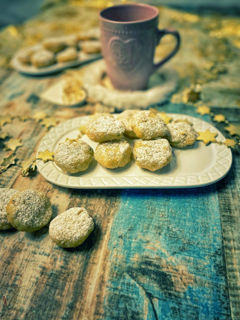 Aquí están las Kahk: quebradizas, no demasiado dulces y ligeramente espolvoreadas con azúcar glas, con harina, mantequilla y sésamo… las hemos preparado juntos durante la cita con ViaggiandoMangiando On air: cena africana.