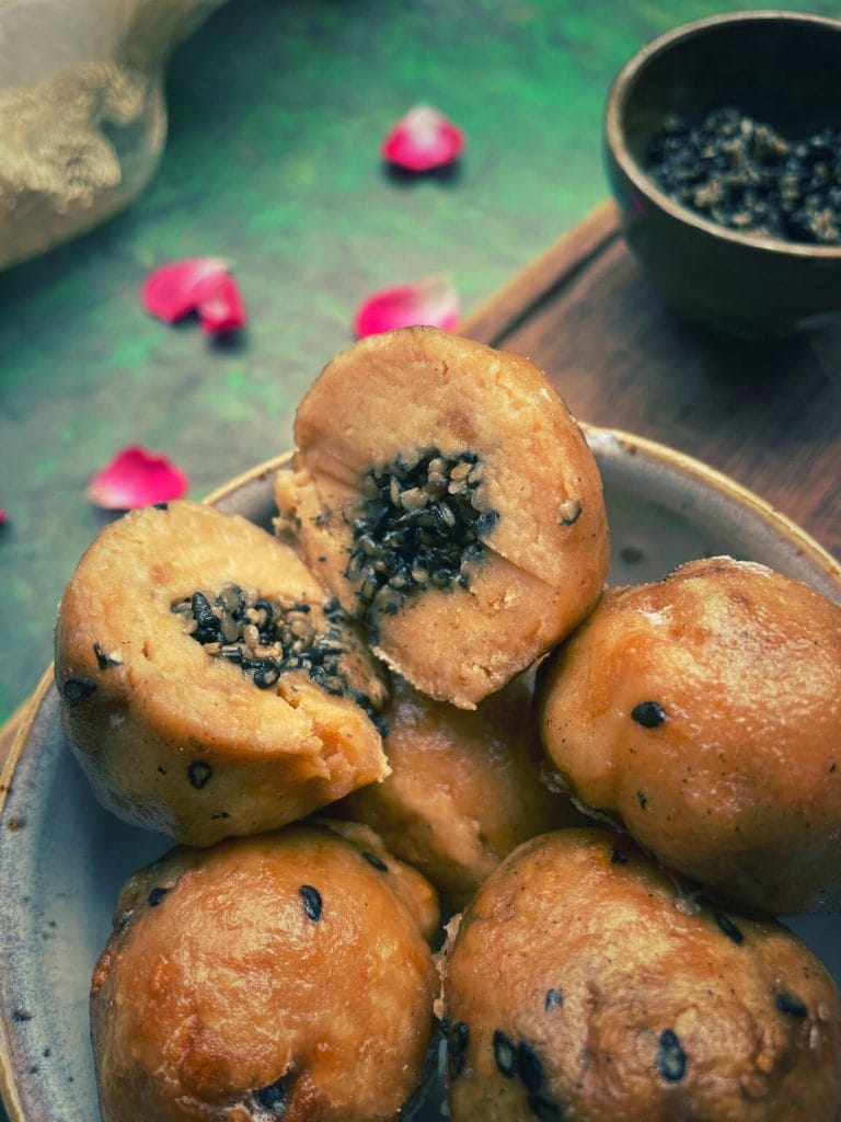 Mi versión es oscura con kokuto (azúcar negro de Okinawa obtenido del jugo extraído de la caña de azúcar) con relleno de sésamo negro (黒ごまあん, kuro goma an), pero si queréis usar el relleno de anko, encontráis la receta en el blog: