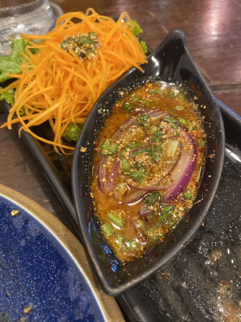 En la foto el Kor moo yang con Nam jim chaeo probado en el «Thanya kitchen» durante la primera parte de mi viaje a Ao Nang en octubre de 2024.