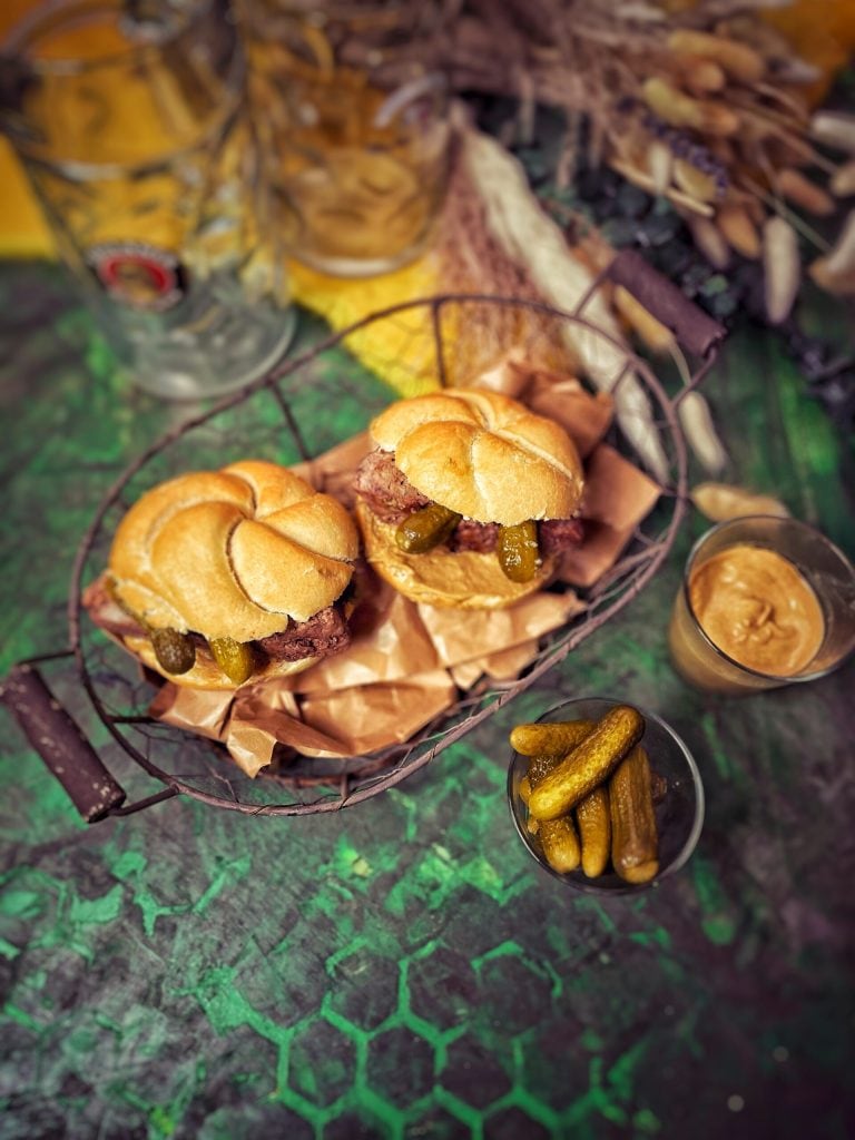 Cortar el panecillo por la mitad, distribuir la mostaza dulce, rellenar con la rodaja de leberkäse y los pepinillos en vinagre.