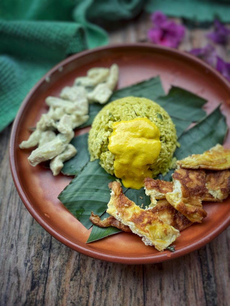 Se trata de arroz cocido en leche de coco con especias aromáticas, a menudo servido con varios acompañamientos como pollo, huevos, tempeh, crema de coco y sambal.