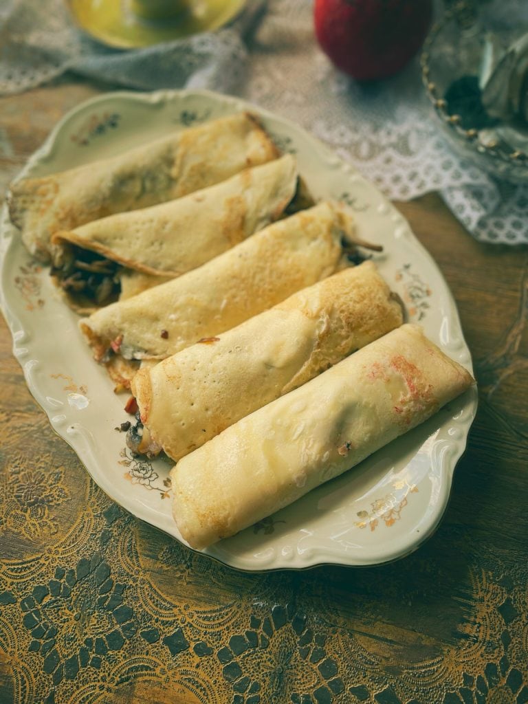 • Para la versión salada, saltea las setas finamente cortadas en un sofrito con cebolla. Rellena los bliny con nata agria y setas y enrolla.