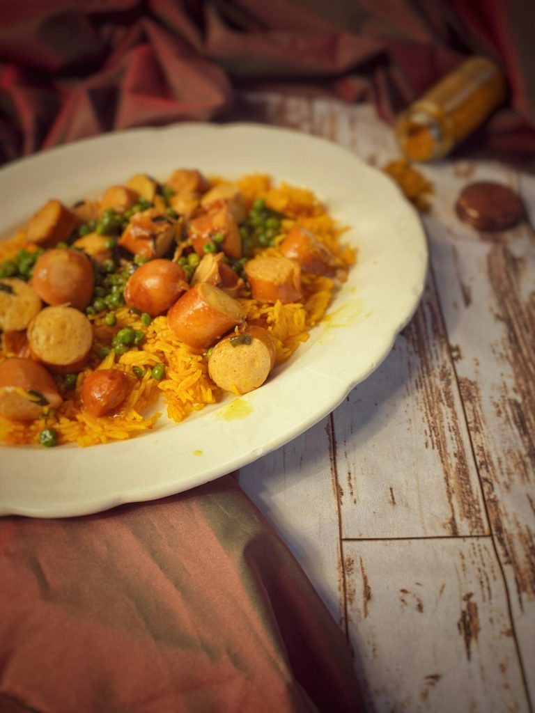En la misma sartén añadir la cebolla, el caldo y el curry, luego de nuevo las salchichas.