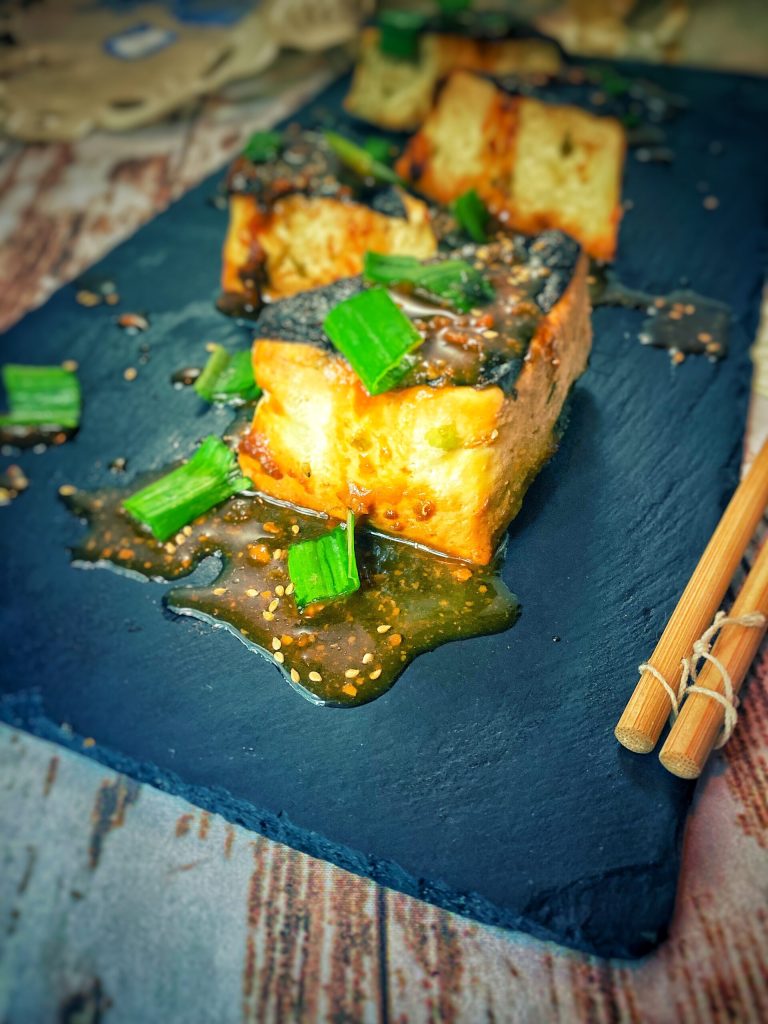 Finalmente, asar a la parrilla por unos minutos el tofu por ambos lados y servir con la salsa de cocción por encima y la cebolleta.