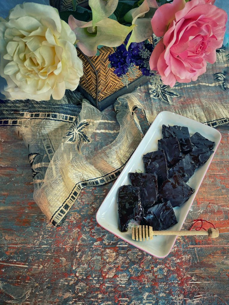 La barra Violet Crumble es un crujiente y dorado honeycomb cubierto de chocolate negro.