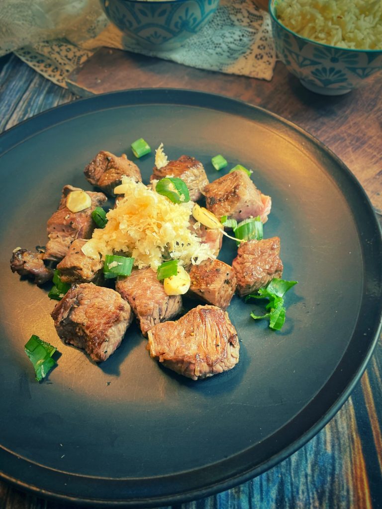 Garlic Steak (al ajo): Una versión «potente» centrada en la intensidad. Prevé un uso abundante de ajo, tanto picado en la cocción como en chips crujientes como guarnición, sin añadir elementos refrescantes.