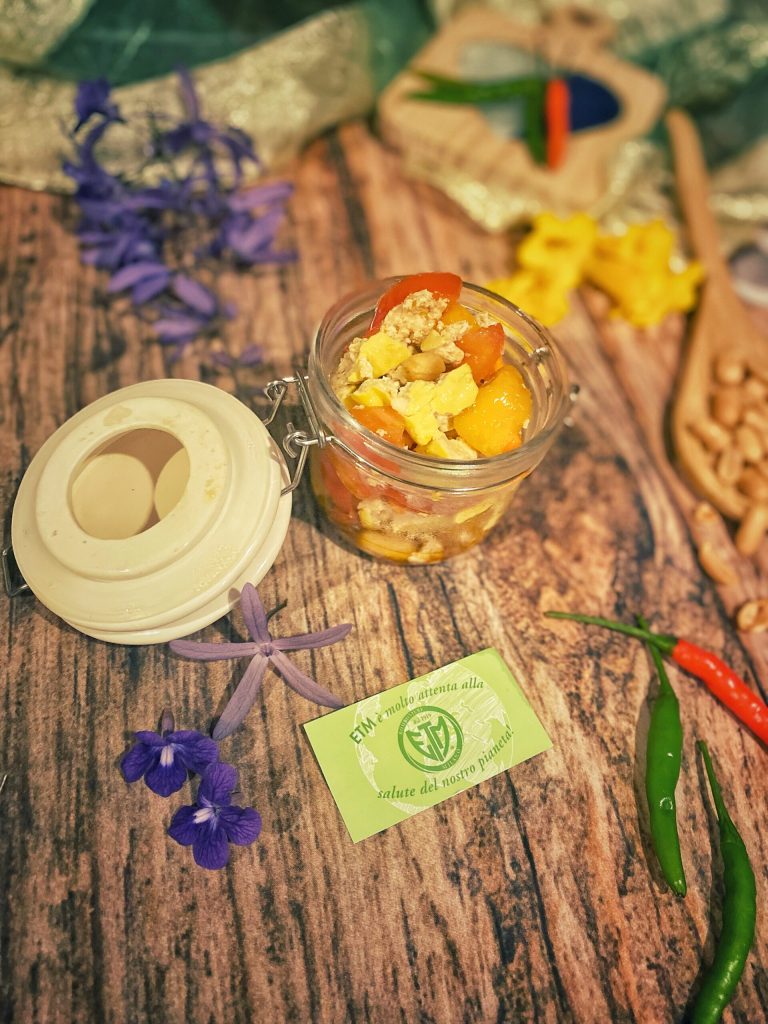➡El tofu reemplaza al pescado, y después de ser desmenuzado (fu fu) y mezclado con pan rallado (o almidón), se fríe y se sirve con una mezcla de salsa de soja, azúcar y lima – elementos imprescindibles de la cocina tailandesa – y con mango, zanahoria, tomate, guindillas y cacahuetes.