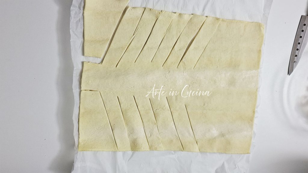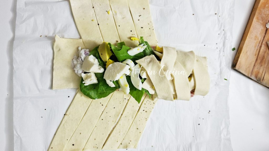 • Coloca la masa con el lado corto hacia ti y haz cortes oblicuos en los lados. Mezcla la ricotta con los embutidos (salami, speck, jamón), sal y pimienta.