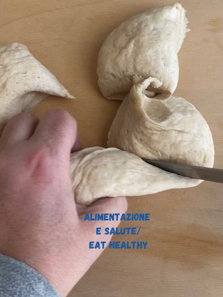 Après deux heures, déplacer la pâte du bol au plan de travail et la diviser en quatre morceaux.